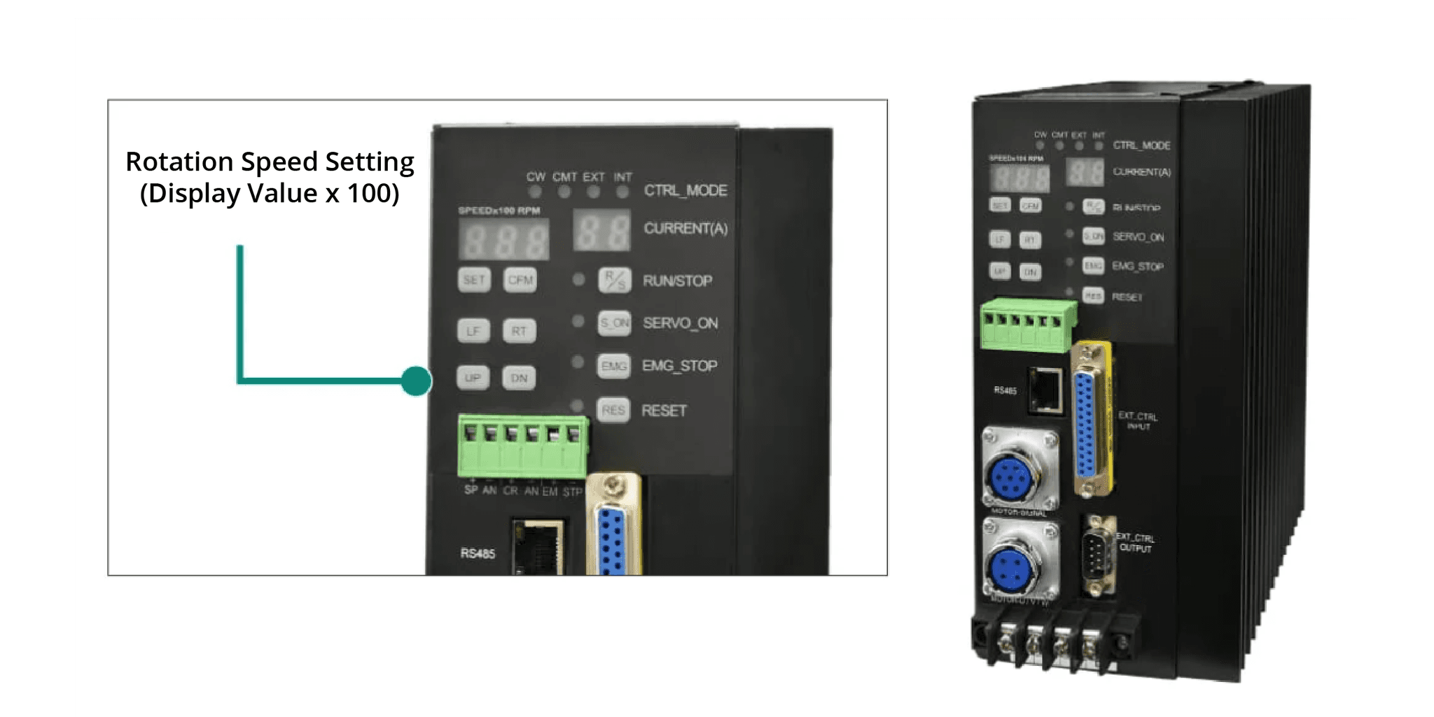최대 20,000분-1까지 설정할 수 있으며, 어떤 회전 속도로도 설정할 수 있으며 디지털 입출력(I/O) 및 Modbus RTU 통신을 통해 제어할 수 있습니다.