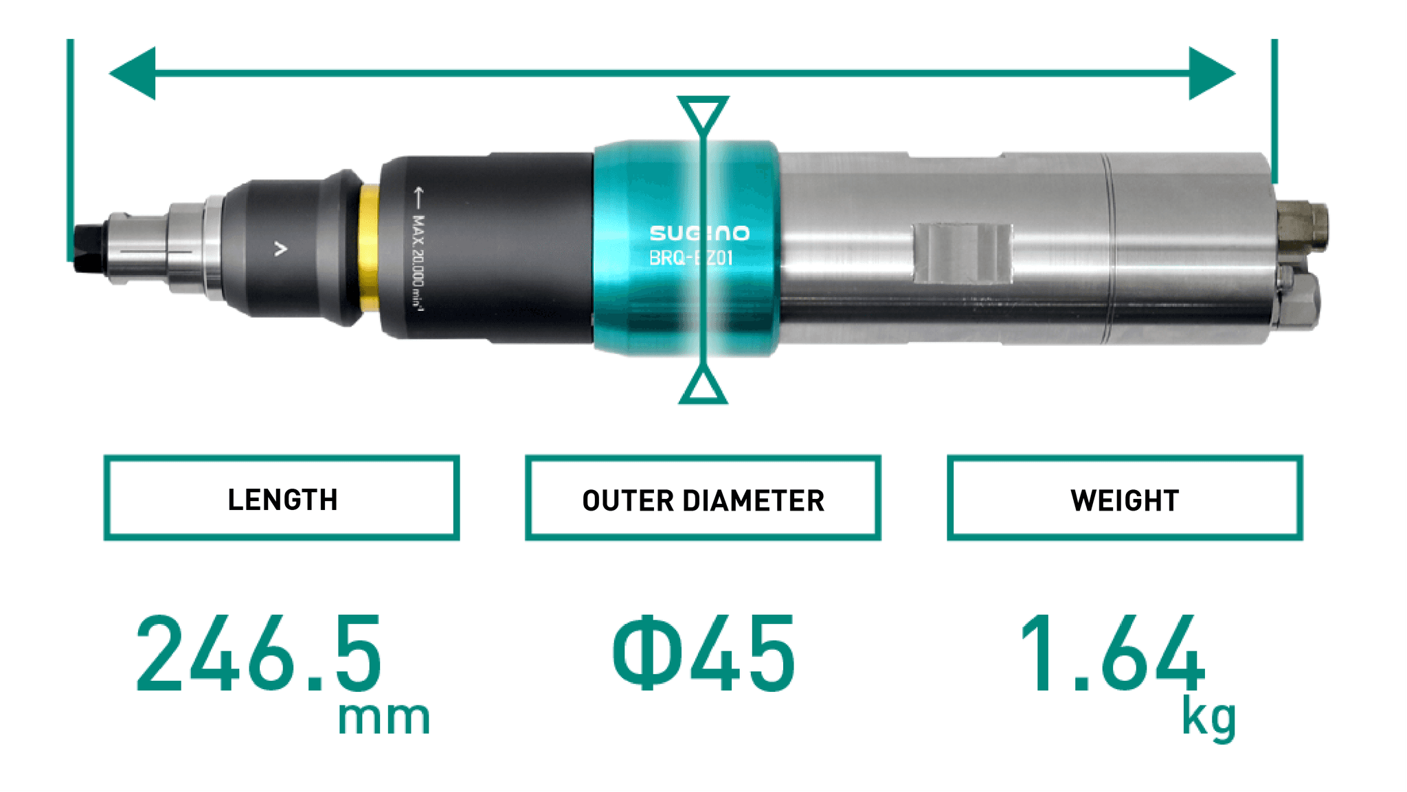 외경 φ40 x 총 길이 246.5mm, 질량 1.64kg의 작고 가벼워서 소형 로봇을 고속 디버링 기계로 변신시킵니다.